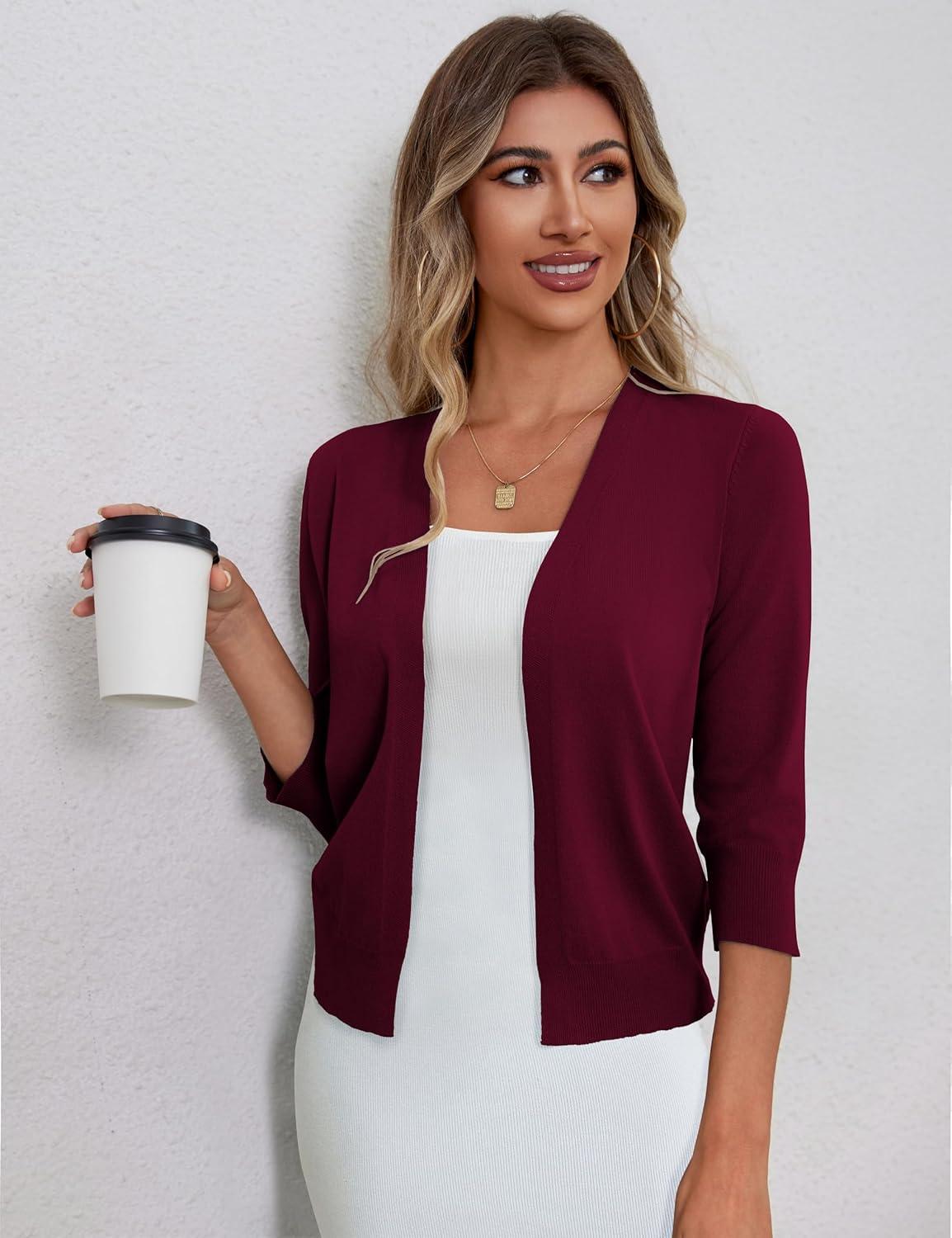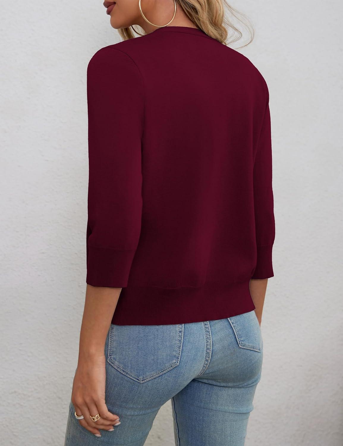 a.Jesdani Shrugs for Women Lightweight 3/4 Sleeve Open Front Red Cropped Cardigan Sweaters(6 Burgundy)