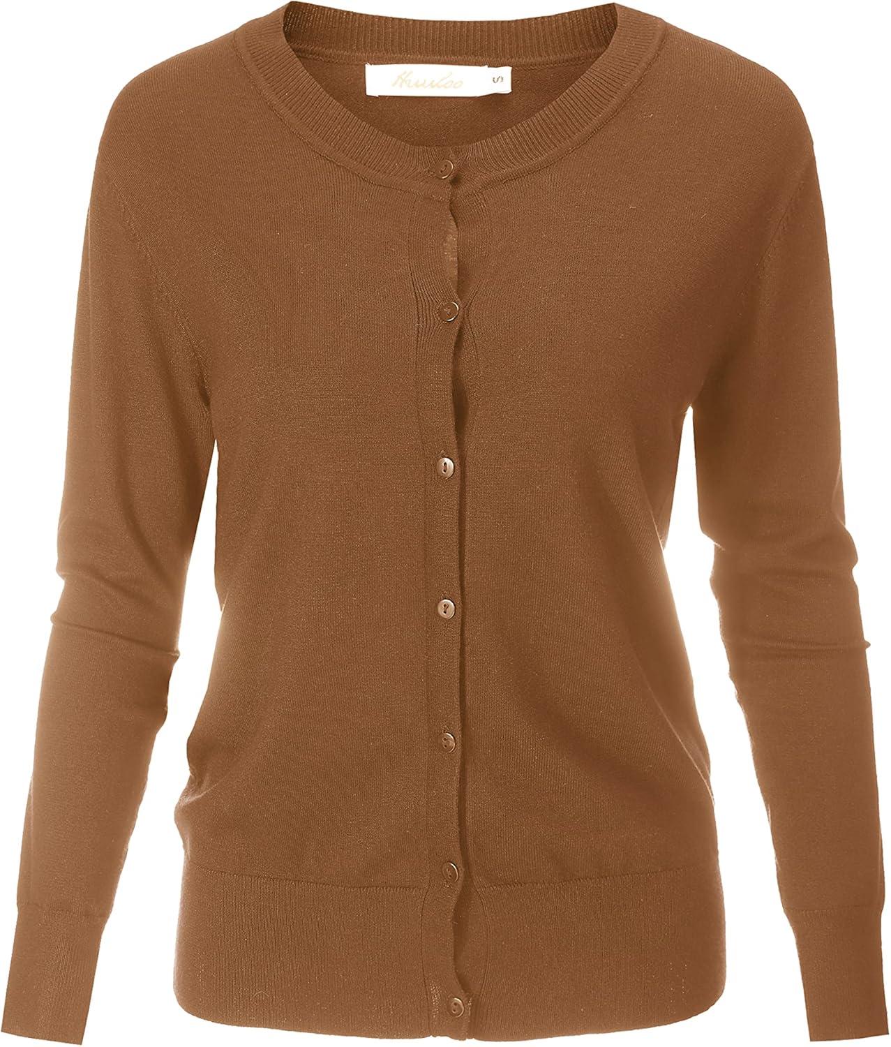 Women’s Crew Neck Button Down Long Sleeve Cardigan Sweater(Brown)